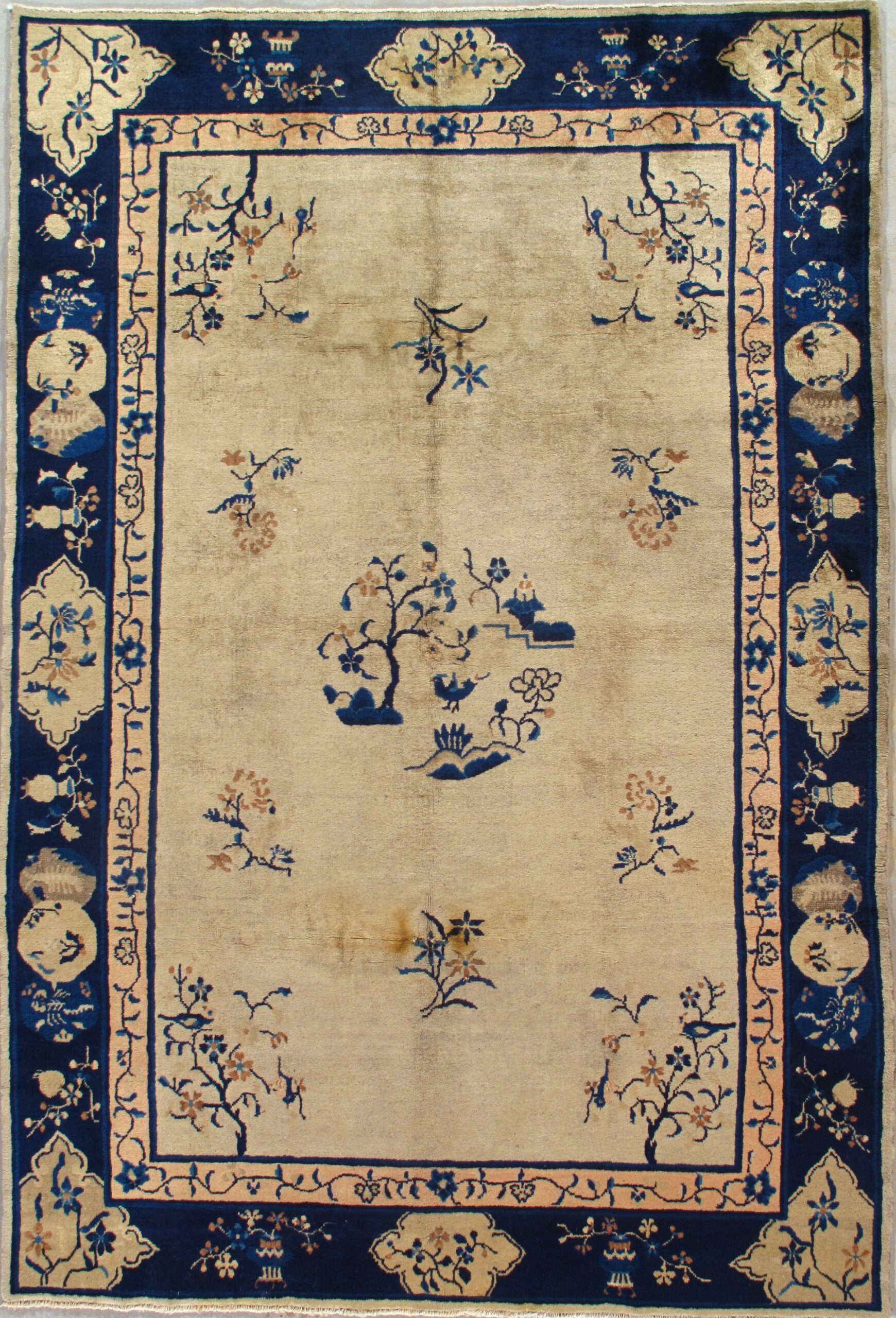 Peking carpets in the blue and white style were particularly popular in the 1880-1920 period. The open old ivory field of this carpet is centred by a mini landscape roundel. Paeony branches float on the ground and slender flowering branches ornament the corners. The navy border has variously shaped cartouches and double gourds with flowering branches matching those of the field. The pile, of Tibetan or Mongolian wool, is of excellent quality, fairly long and the carpet has a lush texture. Chinese carpets of this period are just exotic enough, not overly Chinesey, to work with almost any decor. The overall style does not have to be far eastern. Unlike many Chinese carpets, with their esoteric symbology, this rug has a serene and elegant character. The style is pre-Art Deco and lacks both the geometric stylisation of the Tientsin carpets and the tone-on-tone foliate patterns of the 1920’s Fette Peking carpets.