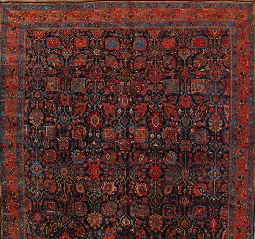 This urban Bijar carpet takes its overall pattern from classic 17th century Persian carpets. A stiff vine lattice encloses a wide variety of colorful palmettes and floral fillers, all on a deep indigo ground. The red border of palmettes and stylized flowers discretely frames the well executed elaborate composition.