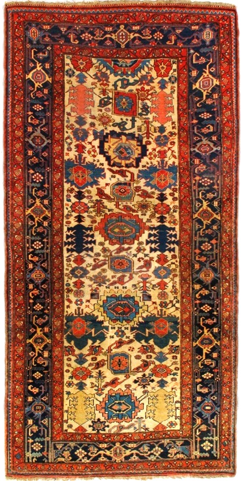 This very colourful Bijar employs an ivory field with discrete palmettes in a rustic version of the classic “harshang” pattern. The equally traditional “turtle” border utilizes geometric palmettes and vines on a deep blue ground.