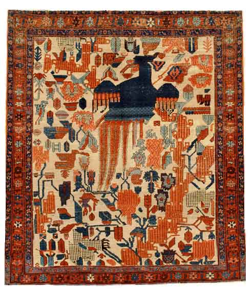 The small format Bakshaish belongs to a group of tapestries are known only from a few specimens. A midst flowering branches sits at the top end of the field a giant blue bird with outstretched wings inverted head and to the side on a curved path pattern leading up to it, which acts as a conductor. His long tail feathers hang down vertically to the center of the field. Characteristic of the style of Bakshaish rugs, all motifs are represented geometrically abstracted.
